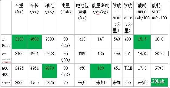 表格中的数据都是从网上找到的,不一定非常正确,如果有误,烦请指正,电量一栏中,括号中表示可用电量,括号外表示标称电量,都留有一定的buffer,避免过充过放,保证电池使用寿命。I-Pace90度电,WLTP工况下,能够形式480公里,WLTP工况是欧洲最新的测试工况,慢慢取代之前饱受诟病的非常不靠谱的NEDC工况,据说我朝马上也要采用具有社会主义特色的中国工况。e-tron 95度电,WLTP工况下续航451公里。ix-3没有实车数据,网上WLTP工况下面整体能耗优于i-pace。如果从电池包的角度看,ix-3是几款车中,轻量化,能耗控制得最好的,可能得益于在BMW i系中大量的工程经验。