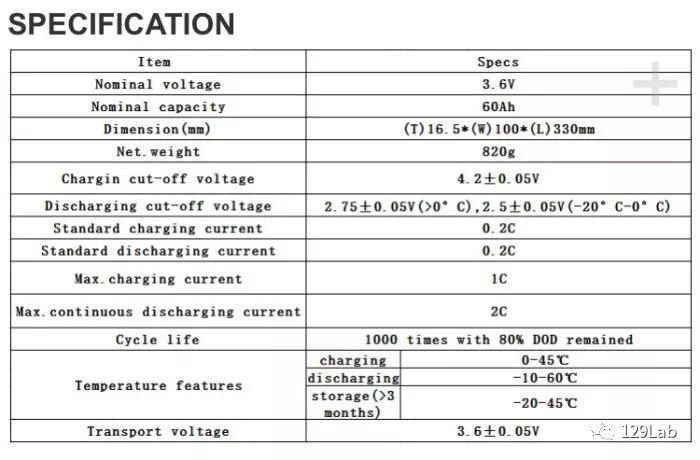 下面是从网上找到的LG 60Ah的电芯参数,标称电压有些网站提示是3.7v