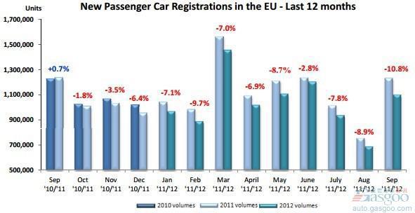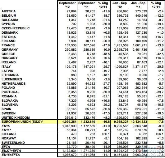 若欧盟27国加上欧洲自由贸易联盟EFTA中的冰岛、挪威和瑞士3个北欧国家,今年9月欧洲的乘用车销量为1,132,034辆,同比下降11.0%,去年同期的销量为1,271,339辆;前三季度销量为9,724,423辆,同比下降7.2%,去年同期的销量为10,473,838辆。