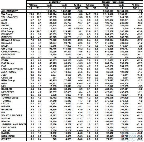 盖世汽车讯 欧洲汽车制造商协会ACEA(European Automobile Manufacturer's Association)日前发布了今年9月份欧洲市场的乘用车销量数据。
