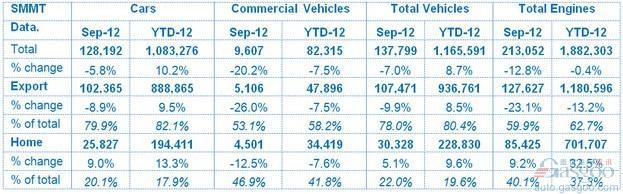 英国9月份轿车产量为128,192辆,同比下滑5.8%;9月份英国商用车的产量达到9,607辆,同比下滑20.2%。