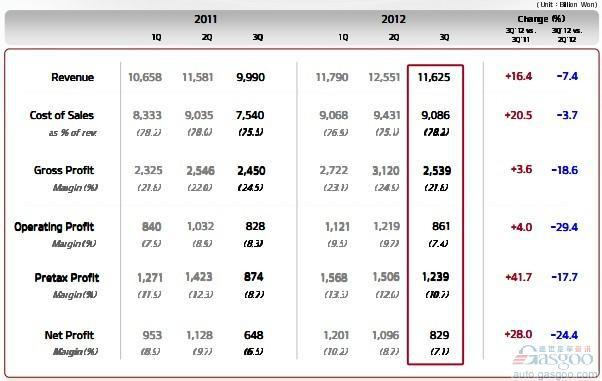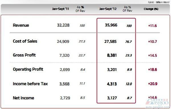 第三季度税前利润为1.239万亿韩元(约合11.2亿美元),同比增长41.7%,税前利润率为1.7%;前三季度税前利润总额为4.31万亿韩元(约合39亿美元),同比增长20.9%。