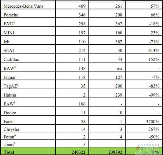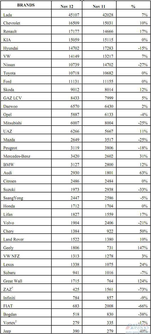 2012年11月俄罗斯轻型车分品牌销量统计