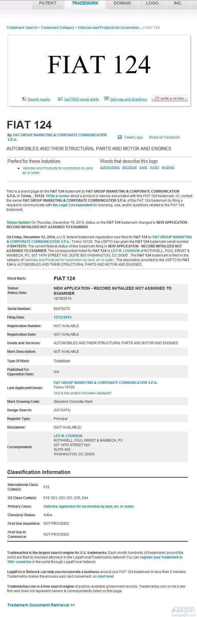 美国专利商标局USPTO(U.S. Patent and Trademark Office)本月中旬公开了菲亚特的最新商标注册申请,“124”和“124 Spider”将用于“汽车及其架构零部件、马达和发动机”。外媒认为,“124”曾在上个世纪用于菲亚特跑车(Roadster),有望成为菲亚特-马自达跑车联合项目的名称。
