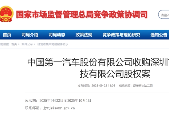 9月22日,国家市场监管总局官网公示了中国第一汽车股份有限公司收购深圳市卓驭科技有限公司股权案。...[详细]