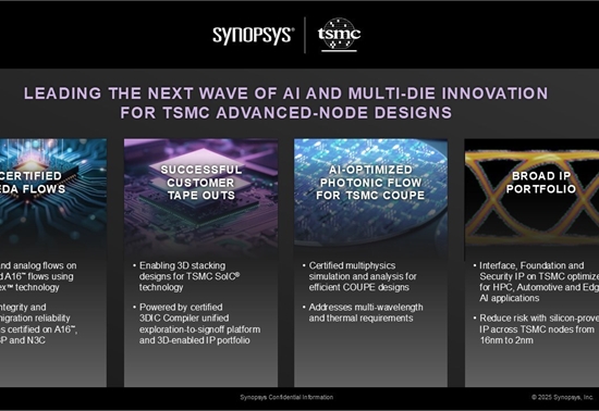 盖世汽车讯 9月24日,新思科技(Synopsys)宣布与台积电(TSMC)继续合作,提供涵盖先进EDA和IP产品在内的多裸片解决方案,支持台积电领先的工艺和封装技术,推动人工智能(AI)芯片和多裸片设计的创新。...[详细]