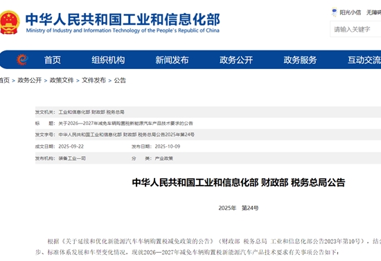 10月9日,据工业和信息化部官网显示,其与财政部、税务总局等三部门近日联合公告2026-2027年减免车辆购置税新能源汽车产品技术要求,明确纯电动乘用车、插电式(含增程式)混合动力乘用车有关技术要求调整等情况。...[详细]