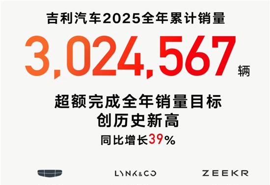 据吉利汽车公告,吉利汽车2025年12月的汽车总销量为236817辆,较去年同期增长约13%;2025年全年汽车总销量为3024567辆,较去年同期增长约39%...[详细]