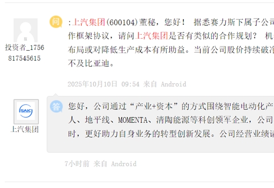 日前,有投资者向上汽集团提问称,“赛力斯下属子公司已与火山引擎签署具身智能业务合作框架协议,请问上汽集团是否有类似的合作规划?”。