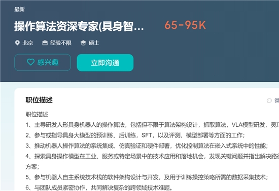 盖世汽车注意到,字节跳动旗下火山引擎团队在招聘平台上启动了一项高规格招聘,岗位名称为“操作算法资深专家”,并后注“具身智能”,月薪待遇高达95-120K(即每月9.5万至12万元)。 ...[详细]