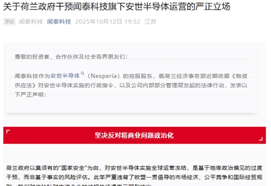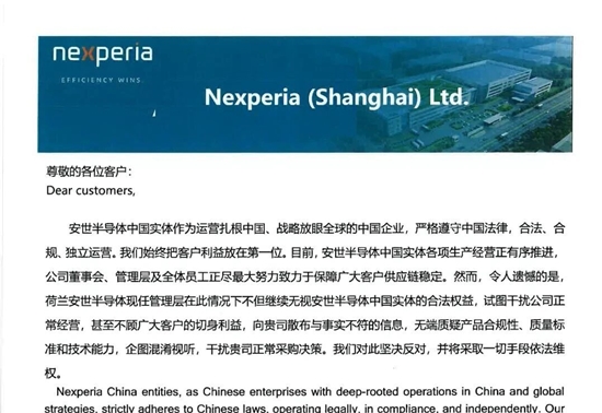 日前,安世半导体(上海)有限公司发布声明,强调安世半导体中国实体作为 “运营扎根中国、战略放眼全球的中国企业”,严格遵守中国法律,合法、合规、独立运营,始终将客