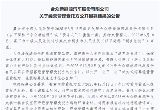 12月19日消息,合众新能源汽车股份有限公司(哪吒汽车母公司)管理人于近日发布了关于经营管理受托方公开招募结果的公告。...[详细]