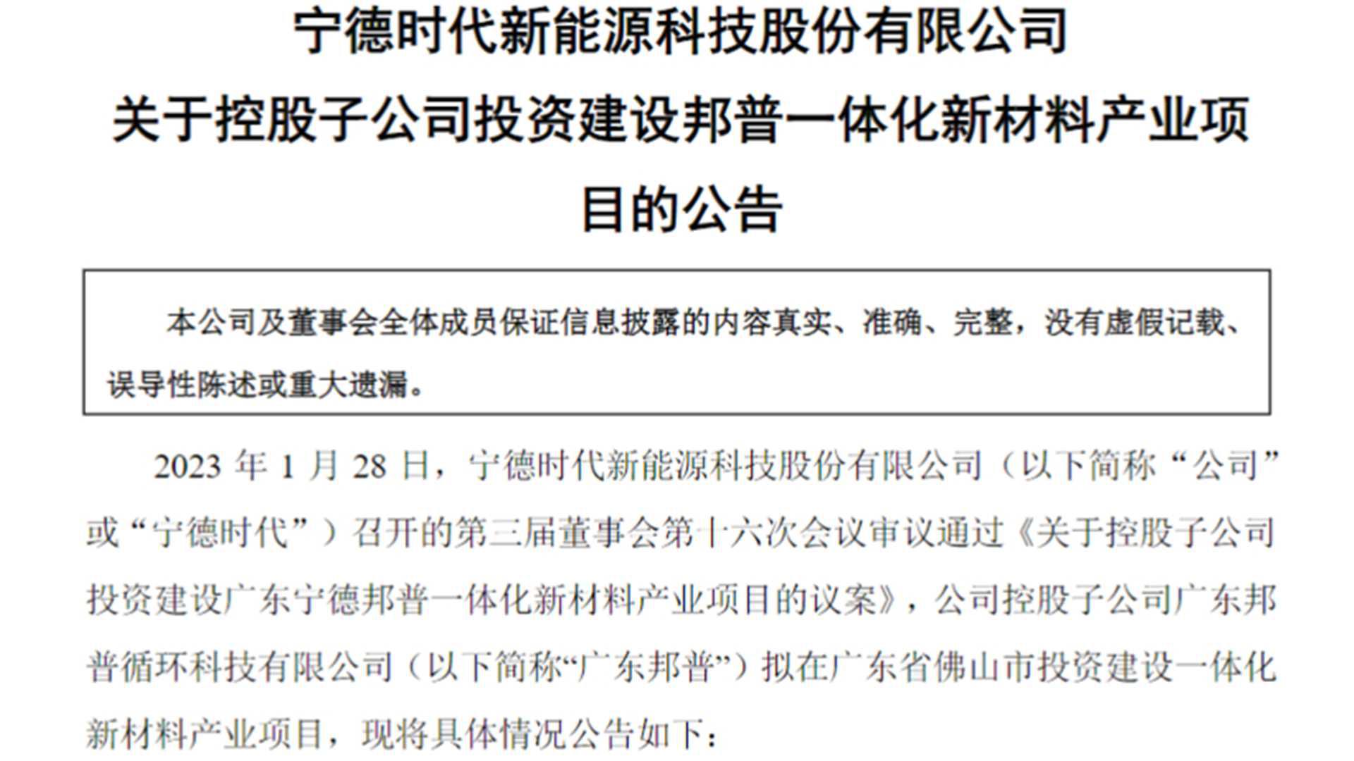 1月30日,宁德时代发布的最新公告显示,公司控股子公司广东邦普循环科技有限公司拟在广东省佛山市佛北战新产业园...[详细]