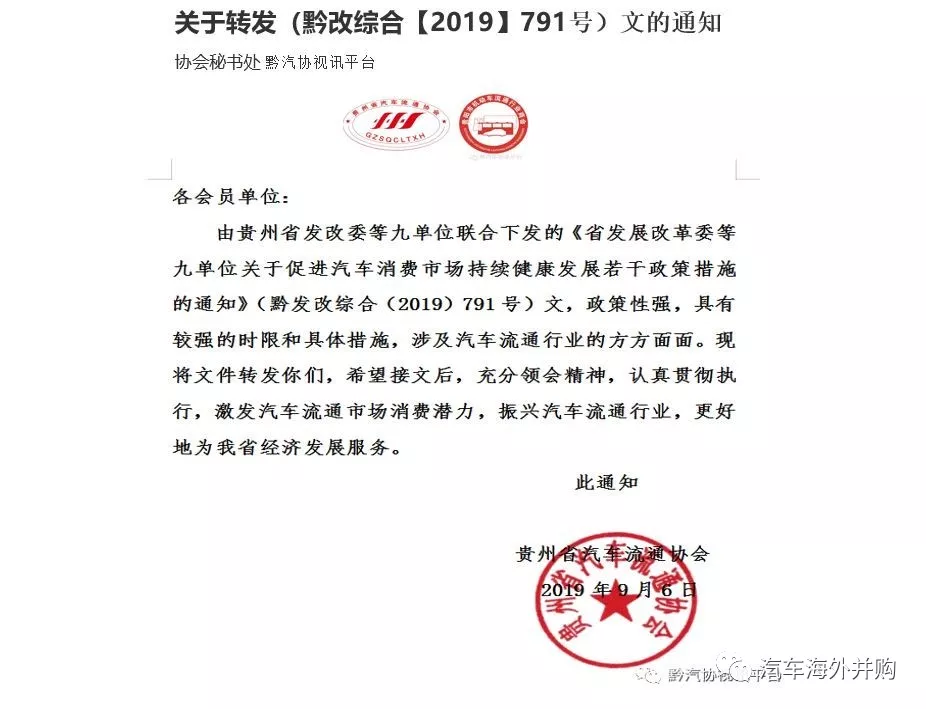 2019年9月6日,贵州省流通协会发布《关于转发(黔改综合【2019】791号)文的通知》的通知,要求贵州省各个汽车流通单位“充分领会精神,并认真贯彻执行。”