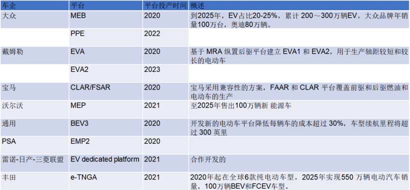 近几年,海外传统大车企根据技术路线的发展需求,陆续启动在新能源汽车领域的战略投入,根据其重要车型/平台的开发时间和产品发布的时间表,从节点来看从2021年开始将开启新一轮快速增长。海外车企开发的第一代电动车专属平台,新车型将在2021年密集上市。与之前在旧平台基础上进行改造不同,新平台纯电动汽车的产品在投入重金打造以后,竞争力有了进一步的提升。而由于纯电动汽车的总体销量可能受到限制,很多的汽车企业选择兼容48V和PHEV两种不同的形式。