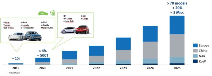 以大众集团的规划为例,2020年新能源产品要做到全部销量的4%,也就是近50万台的量,2021年接近100万台的目标,其中有65%是在欧洲,也就是有65万台的新能源汽车。