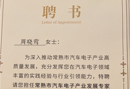 10月28日,为深入推动汽车电子产业高质量发展,常熟市人民政府正式向周晓莺女士颁发聘书,聘请其担任常熟市汽车电...[详细]