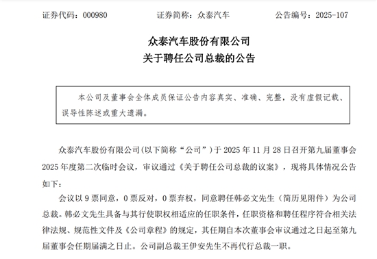 12月3日消息,众泰汽车于近日召开董事会,全票通过决议,聘任韩必文为新任总裁。任期自本次董事会审议通过之日起...[详细]
