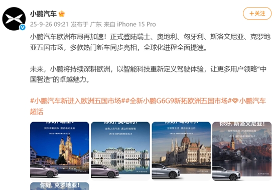 9月26日,小鹏汽车宣布欧洲布局再加速,正式登陆瑞士、奥地利、匈牙利、斯洛文尼亚、克罗地亚五国市场,多款热门...[详细]