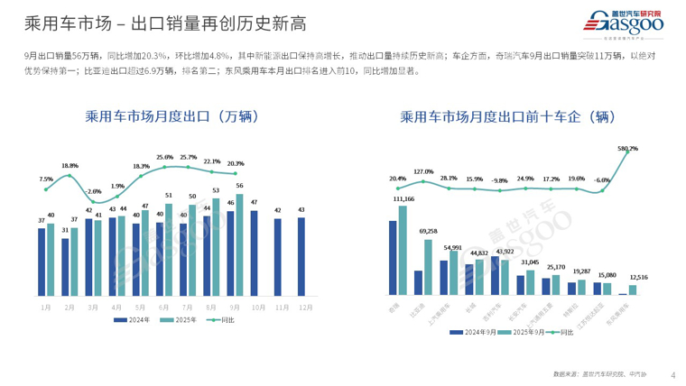 9月产销均突破285万辆,再创历史同期新高;年末多政策临近结束,车市增长强势;9月新能源销量突破150万辆,新能源渗透率增加至52.9%;出口连续四个月销量同比增速超过20%,9月出口量再创历史新高