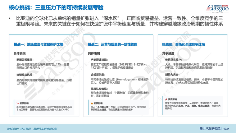 作为全球新能源汽车革命的领潮者,比亚迪的国际化进程已从“中国制造出海”的单点突破,演变为一场“技术标准、产业模式与商业模式”的系统性输出。本报告将深入解码比亚迪实现跨越式追赶的内在逻辑,剖析其在全球关键市场的多维竞争策略,并审视其构建可持续全球领导地位所面临的机遇与挑战。