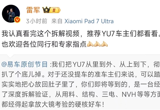 11月5日,小米创始人雷军在社交媒体上转发了一条关于小米YU7的全网首拆视频,并表示:“我认真看完这个拆解视频,...[详细]
