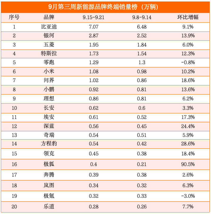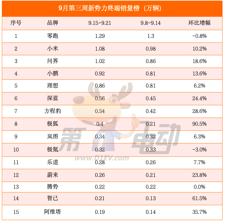 榜单中段的竞争尤为激烈,极狐、智己、阿维塔成为本周 “增长黑马”,周销量环比涨幅均超 30%。其中极狐的表现最为抢眼,9月15日正式上市的A0级纯电SUV T1 成为销量助推核心引擎。