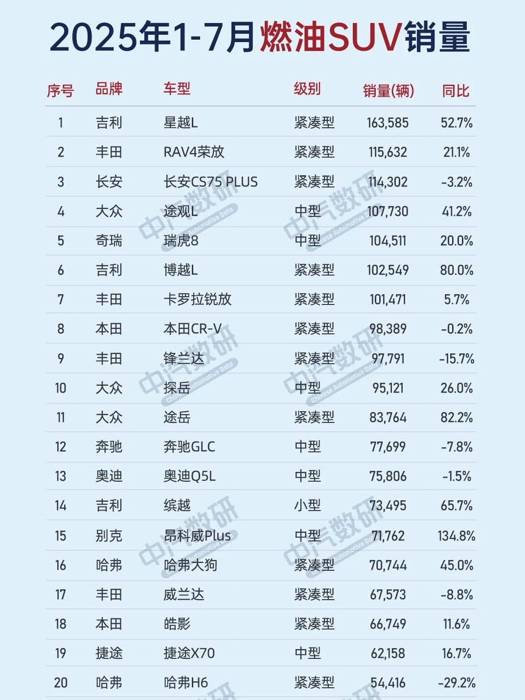 中汽研数据显示,2025年1-7月燃油车销量排名中,吉利星越L以16.36万辆的销量位居第一,同比增长52.7%。这款紧凑型SUV以15万元左右的售价碾压丰田RAV4荣放、大众途观L等一众经典合资车型,其销量甚至超越了日产轩逸、大众朗逸、速腾等经典轿车。此外,吉利博越L、星瑞的销量也在对应细分市场持续增长,实现了对合资品牌的赶超,成为市场关注的焦点。