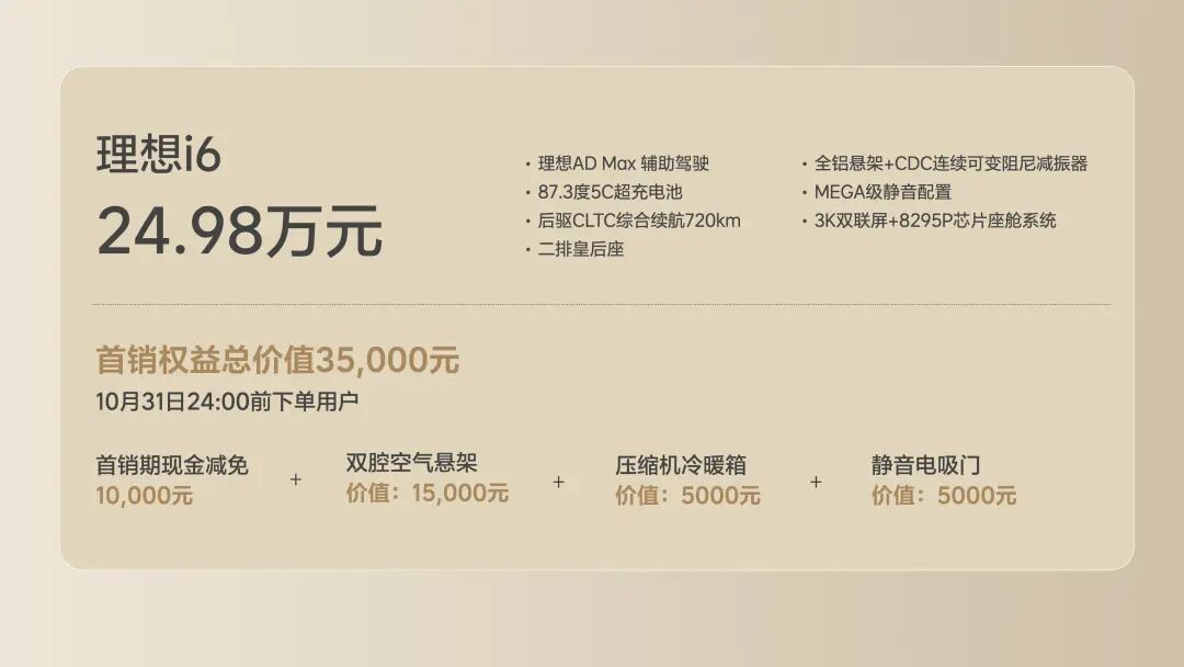 不过在首销期,在10月底之前下单的用户还可以获得1万元的现金减免,另外获赠总额2.5万元的双腔空悬、压缩机冷暖箱和静音电吸门。