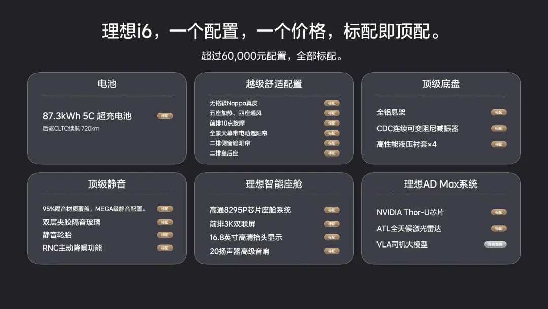 理想i6在配置上仍然极具诚意,提供三电、舒适、底盘、静音、智能座舱和辅助驾驶系统六个方面超过6万元的标配配置。整车搭载87度的5C电池,后驱版本CLTC续航里程达到720km,也可选装至双电机四驱版本。