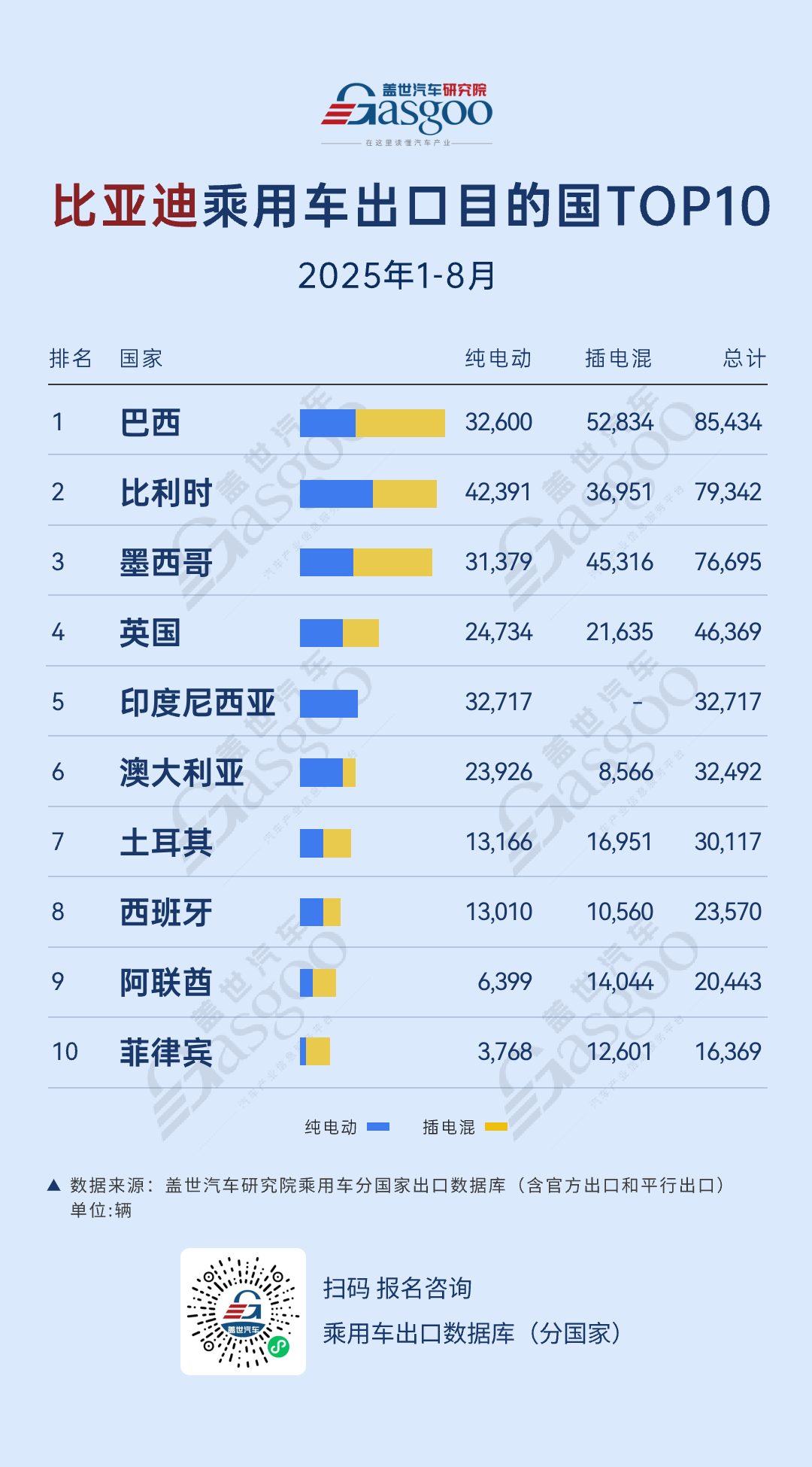 NO.1 巴西。2025年1-8月,向巴西出口纯电动乘用车32,600辆,插电混合动力乘用车52,834辆,总计85,434辆。