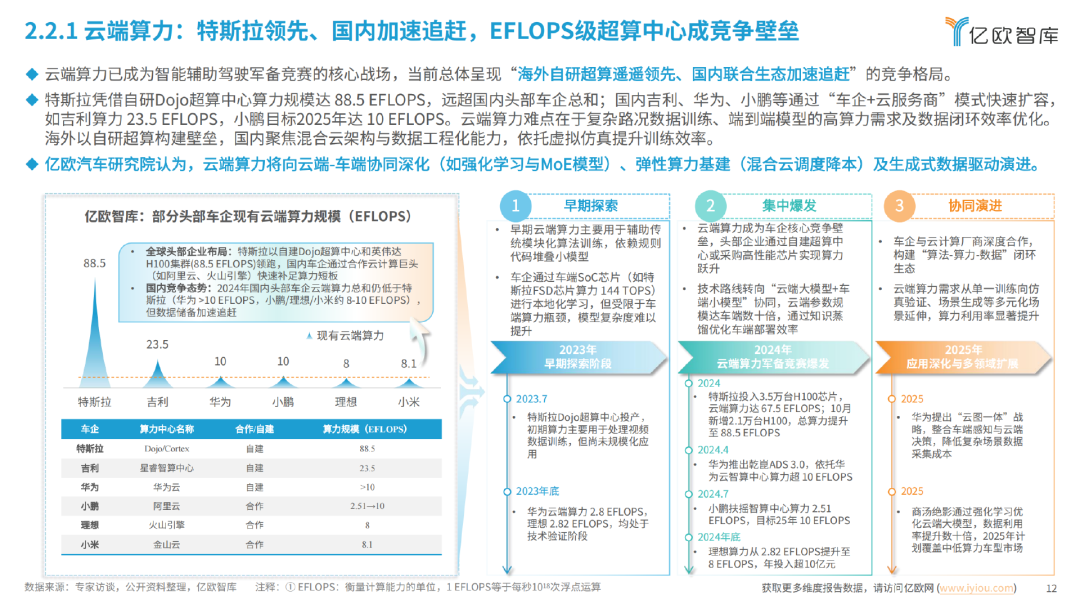 据亿欧智库发布的《2025中国高阶智能辅助驾驶最新技术洞察》报告,在云端算力储备方面,头部公司特斯拉以自建Dojo超算中心和英伟达H100集群领跑,国内车企则通过与云计算巨头合作(如阿里云、火山引擎等)来快速补足短板。