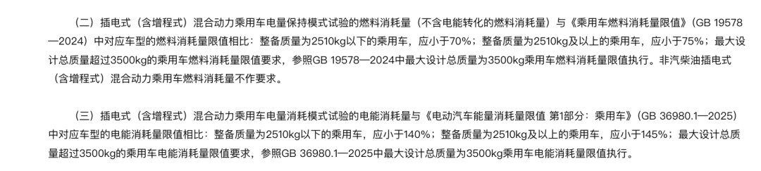 整备质量为2510kg及以上的插混乘用车,百公里电耗应小于GB 36980.1—2025限值应的145%,也就是应该在26.1kWh以内。
