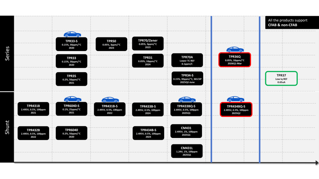 如基准芯片TPR70A在- 40℃~125℃全工作温度范围内,温漂系数低至 0.1ppm/℃,可满足高端测试仪器、医疗设备等对温度敏感性要求极高的场景;TPR50、TPR70等产品初始精度高达0.05%,可满足精密数据采集系统的要求。而针对不同客户需求,思瑞浦还积极和细分领域的头部客户合作,定义下一代电压基准产品,满足更多样的需求。如高精度并联基准TPR433Q系列产品,已进入头部车企的高端车型验证流程。