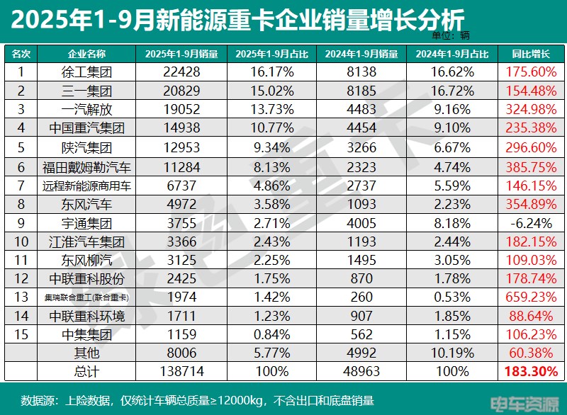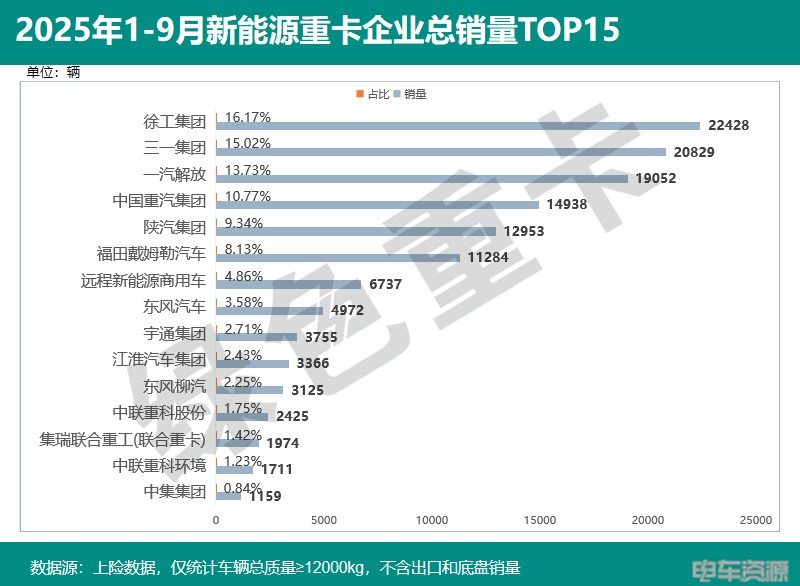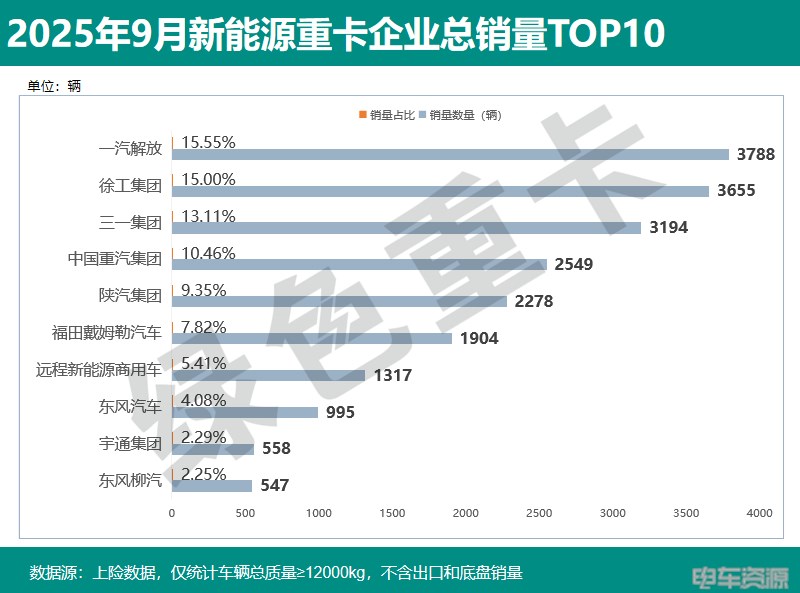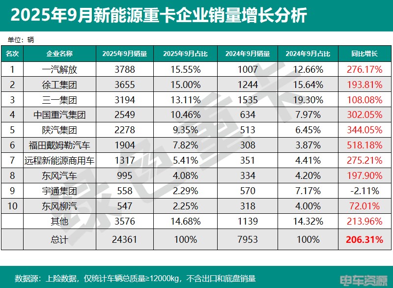 9月份新能源重卡销24361 同增206.31% 解放/徐工/三一居前三