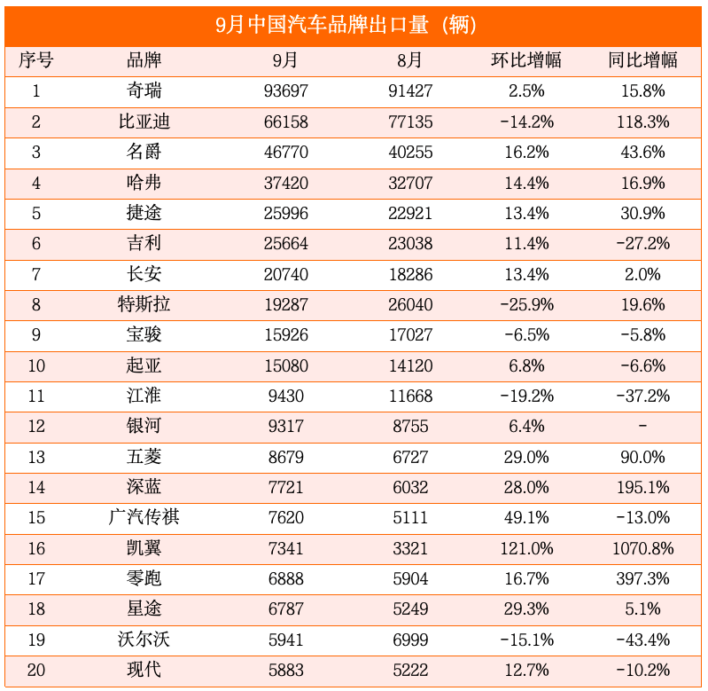 9 月中国汽车出口品牌 TOP20 榜单中,头部品牌竞争呈现 “一超多强” 格局,奇瑞以绝对优势蝉联冠军,比亚迪则凭借超高同比增幅成为增长焦点。