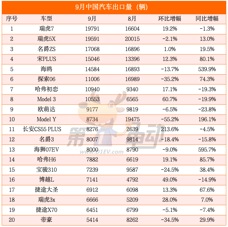 9 月中国汽车出口车型 TOP20 榜单中,奇瑞系与比亚迪系成为最大赢家。奇瑞旗下瑞虎 5X 与瑞虎 7 以 19791 辆的出口量并列榜首,其中瑞虎 7 环比增幅达 19.2%,展现出在海外 SUV 市场的稳固竞争力。
