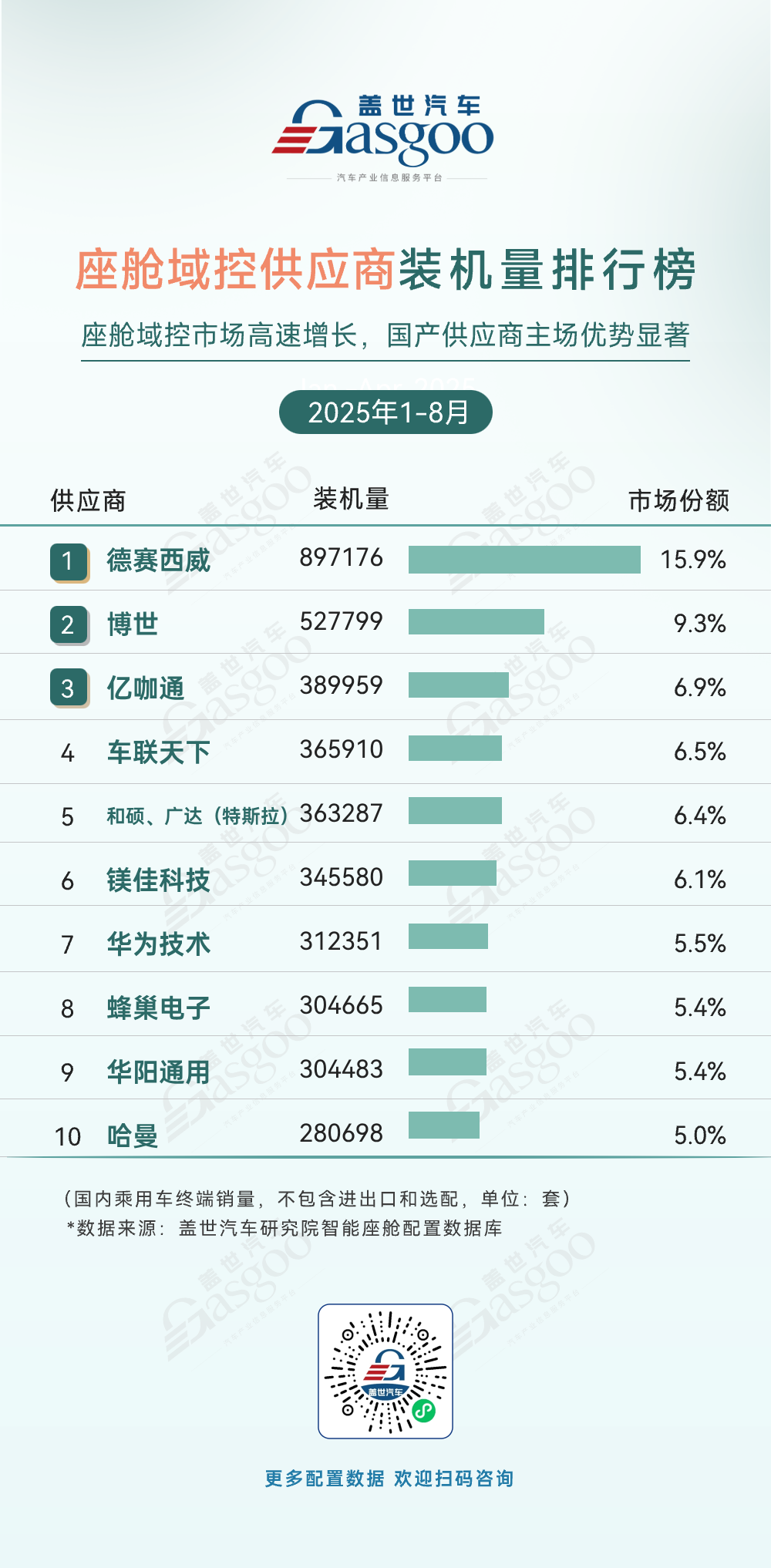 德赛西威,2025年1-8月装机量897176套,市场份额15.9%。