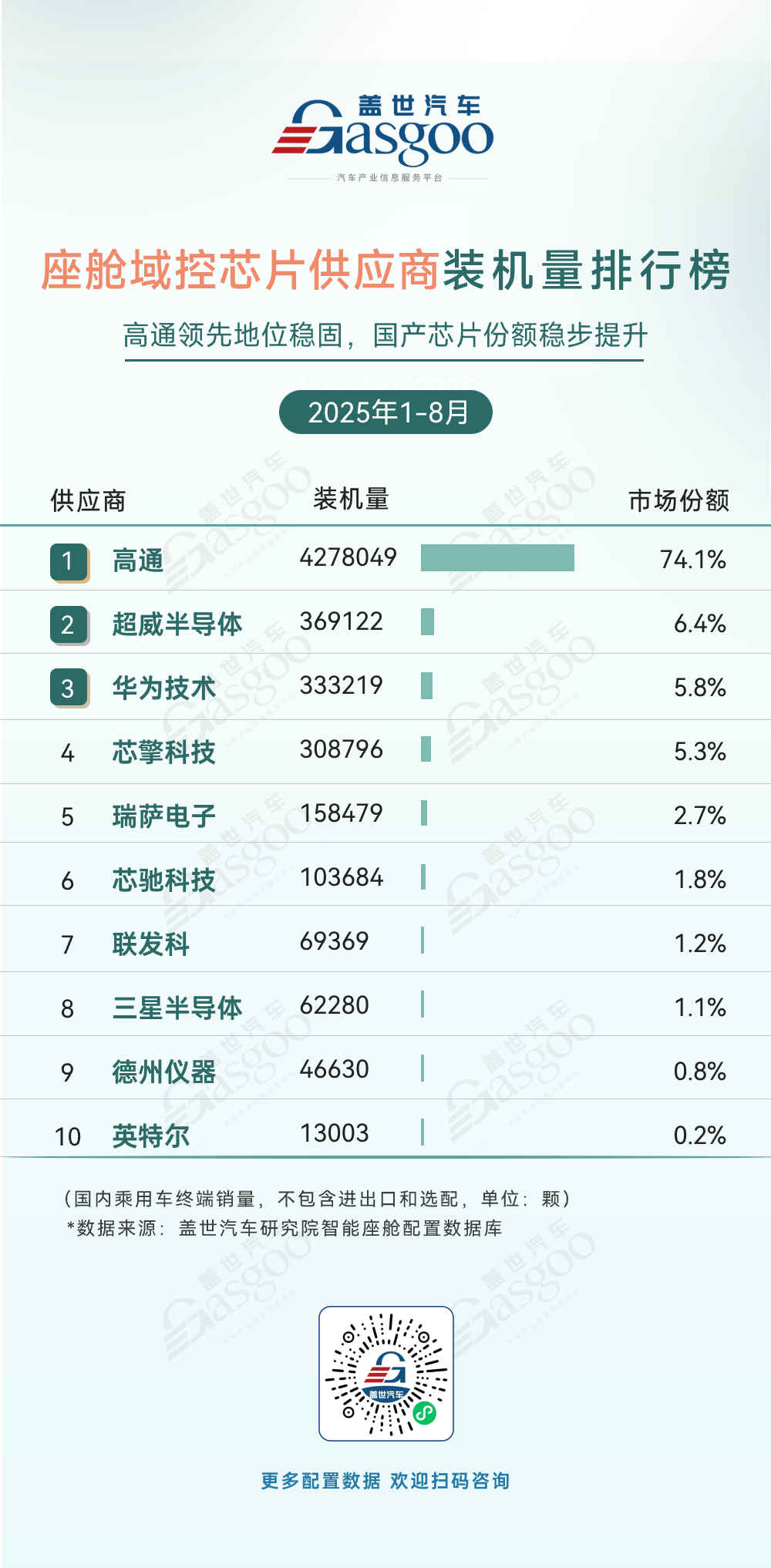 1-8月座舱域控芯片市场呈现 “一超强势领跑,国产芯片份额稳步提升” 的格局,高通以74.1%的市场份额和超427万颗的装机量,持续稳固其绝对领先地位,其技术与规模壁垒在短期内仍具不可替代性。国产芯片供应商表现亮眼,华为技术、芯擎科技、芯驰科技等企业市场份额稳步提升,充分彰显国内芯片企业在车载域控领域的突破实力与成长潜力。