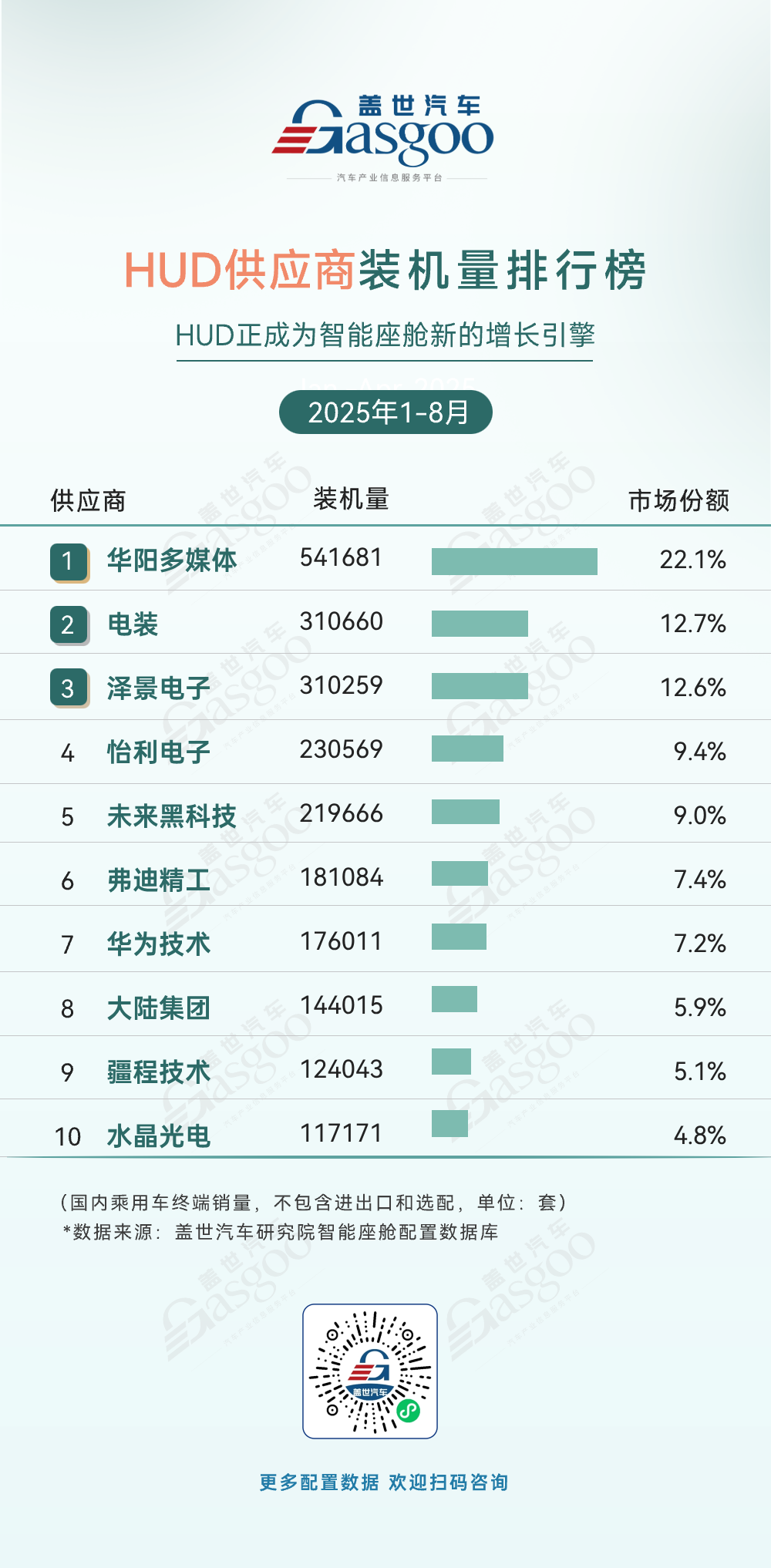 1-8月,车载HUD市场呈现 “头部领跑、多元竞逐” 的格局。并且,HUD市场正成为智能座舱新的增长引擎。华阳多媒体以22.1%的市场份额领跑,凭借超54万套的装机量巩固头部地位;电装、泽景电子紧随其后,市场份额差距微弱,头部阵营竞争尤为激烈,尚未形成绝对垄断格局。怡利电子、未来黑科技在9%左右的份额区间展开胶着竞争;弗迪精工、华为技术等国产厂商与大陆集团等传统Tier1同台竞技,折射出HUD赛道参与者的多元化属性。伴随车载显示领域差异化竞争的持续升级,HUD作为智能座舱的核心配置,供应商需在AR-HUD技术迭代、与主机厂的深度生态融合及规模化产能保障等维度持续实现突破。在此进程中,既有华阳多媒体等本土企业的主场优势加持,也有国际Tier1的技术积淀支撑,更有华为等科技企业的跨界赋能助力,多方力量协同发力,将推动HUD市场向更智能、更具竞争力的方向演进,为行业增长持续注入强劲动能。