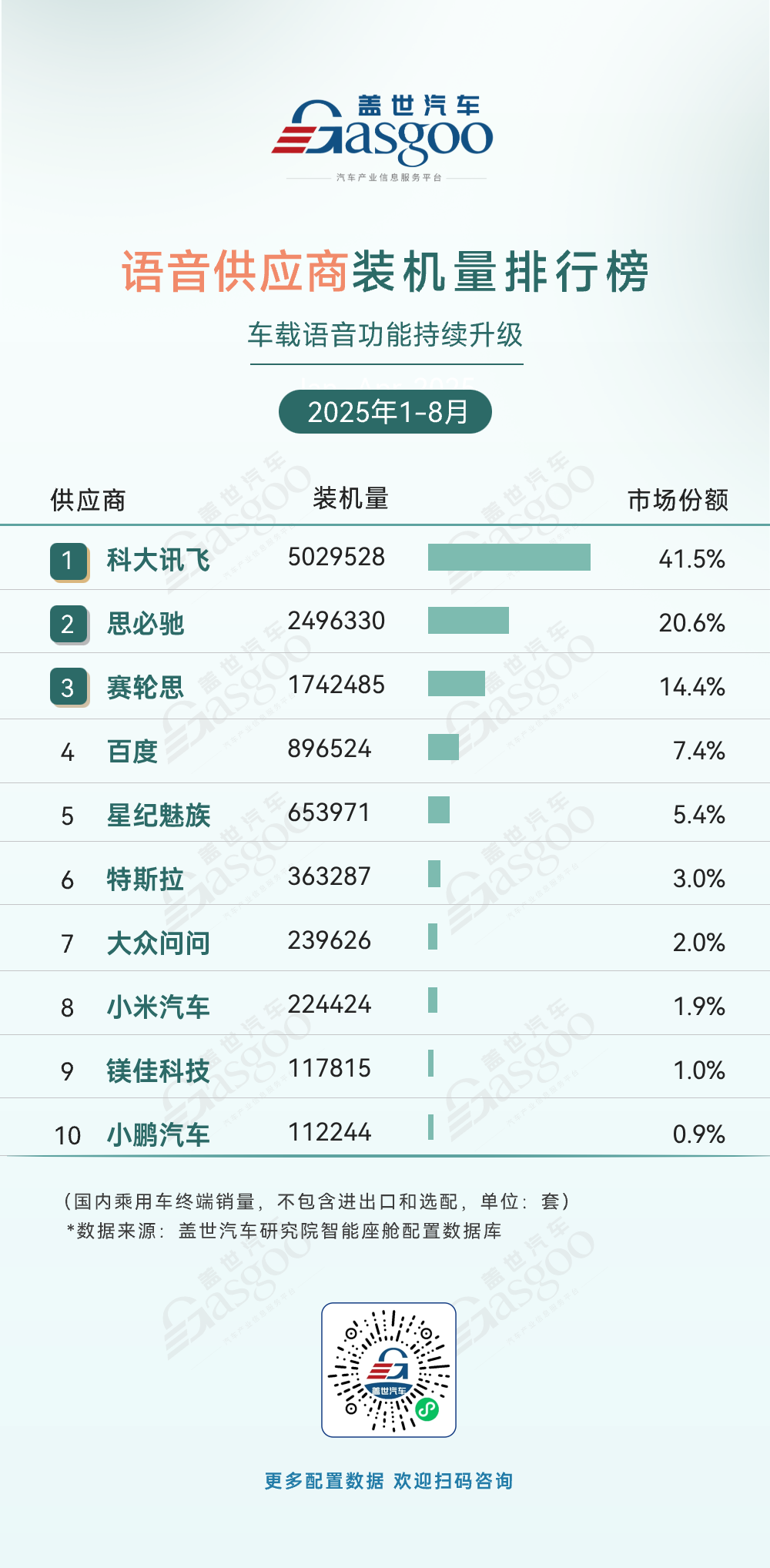 1-8月,伴随 “车载语音功能持续升级” 的行业趋势,本土供应商在语音市场中占据绝对主导地位。科大讯飞以41.5%的市场份额遥遥领先,超502万套的装机量构建起明显的头部优势,思必驰的市场份额超过20%,为车载语音功能的迭代升级提供了强劲动力。百度、星纪魅族等企业凭借自身生态资源跨界入局参与竞争,而特斯拉等外资厂商的市场份额则相对有限。整体而言,本土供应商依靠技术适配性、服务响应速度以及对国内用户需求的精准洞察主导着市场格局,后续技术的持续迭代能力、与智能座舱生态的融合深度将成为竞争的核心焦点,外资品牌需进一步加强本土化创新以提升市场影响力,行业在技术突破与场景拓展的双重驱动下,将持续为用户带来更为智能的语音交互体验。