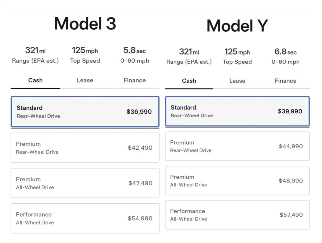作为廉价版车型,Model Y Standard已于10月7日在美国发布,售价39,990美元(约28.47万元人民币),计划11-12月交付,Model 3 Stanard的起售价也降到36,990 美元,显然都只是第一步。