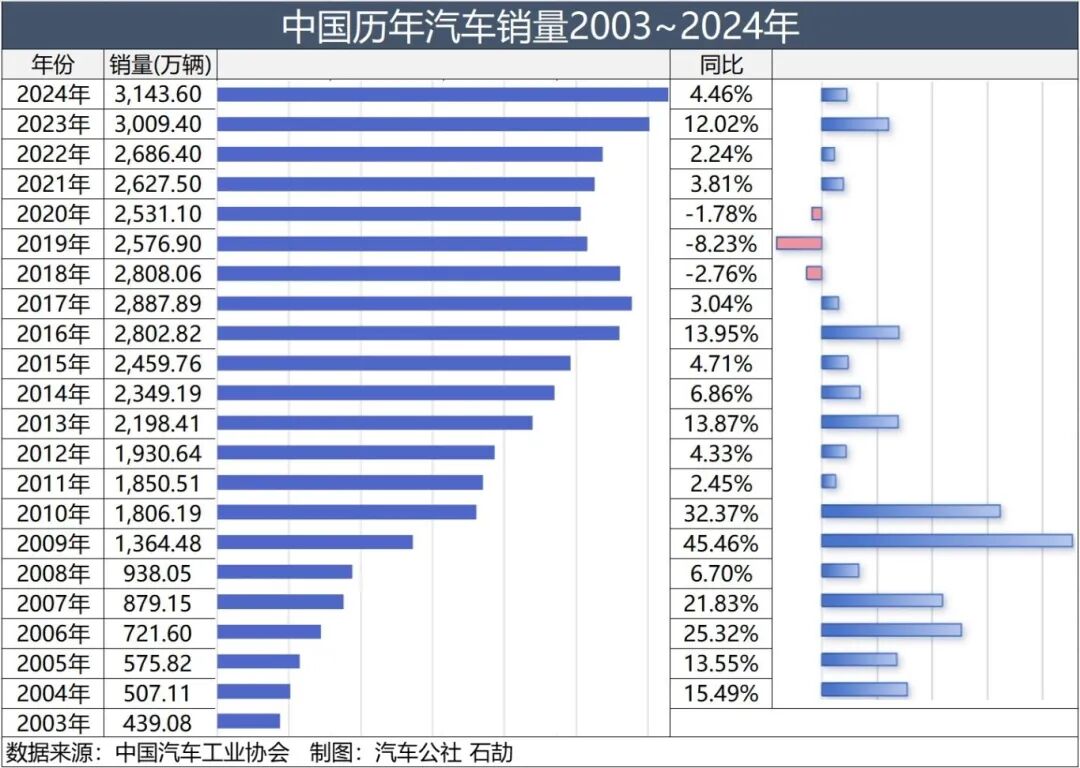 自2009年中国跃居全球最大汽车市场以来,2009-2010年,2013年和2016年均出现过全国汽车年销量两位数比例同比增长。