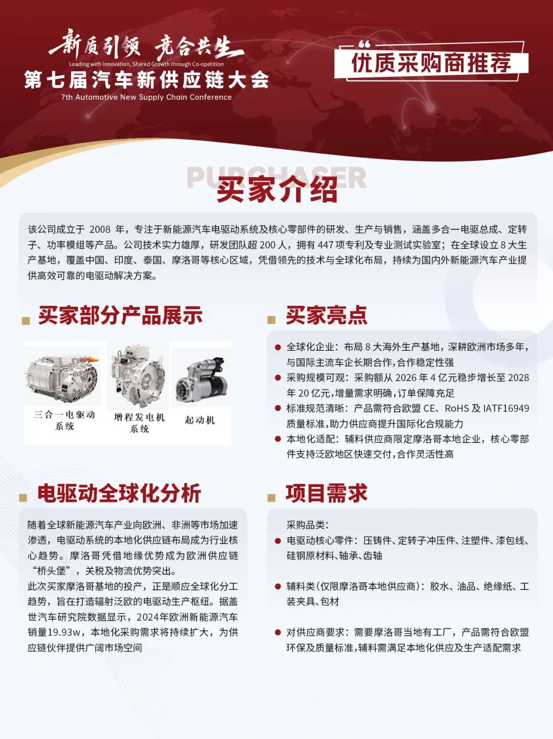本次项目需求包括压铸件、定转子冲压件、注塑件、漆包线、硅钢原材料、轴承、齿轴及辅料。供应商需在摩洛哥地区有工厂,摩洛哥本地供应商更佳。如您希望了解更多合作细节,欢迎在本文评论区留言,或私信公众号后台与我们联系。