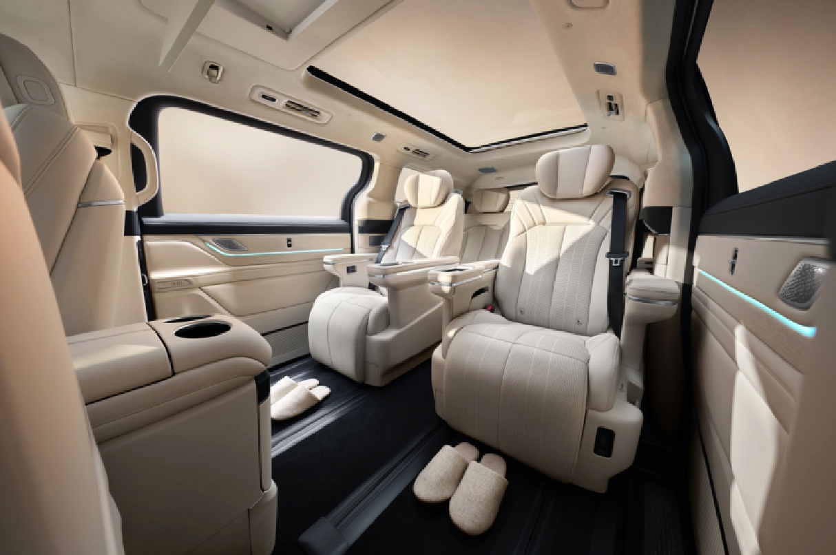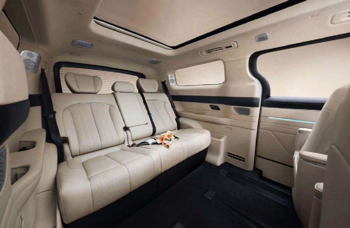 内部座舱呈现出了旗舰级的奢适格局,舱内色彩温暖柔和,营造出自然舒适的氛围。超大面积全景天幕延伸至第三排上方,使得整车视野更加开阔通透。二排座椅宽大舒适,尽显尊贵感;三排同样空间充裕,打破了传统MPV三排局促的刻板印象,也意味着用户将享受到与以往截然不同的豪华出行体验。二排小桌板进一步拓展了使用场景,移动办公、会客等皆可轻松实现。细节处的储物空间设计,也体现出银河V900无微不至的贴心考量。