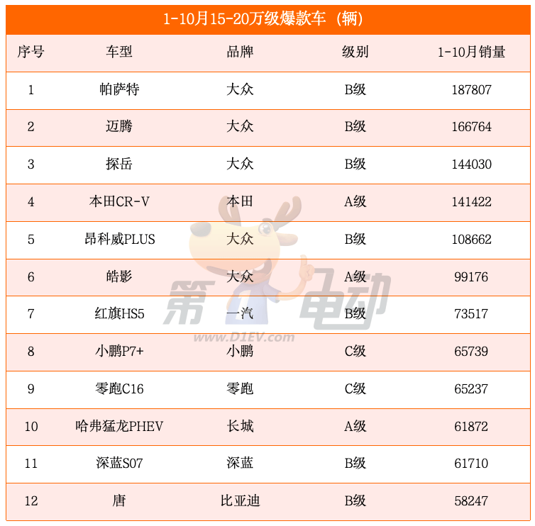 截至2025年10月,15-20万价位段内,满足 “月销超5000辆、累计销量超5万辆” 标准的爆款车型达12款。