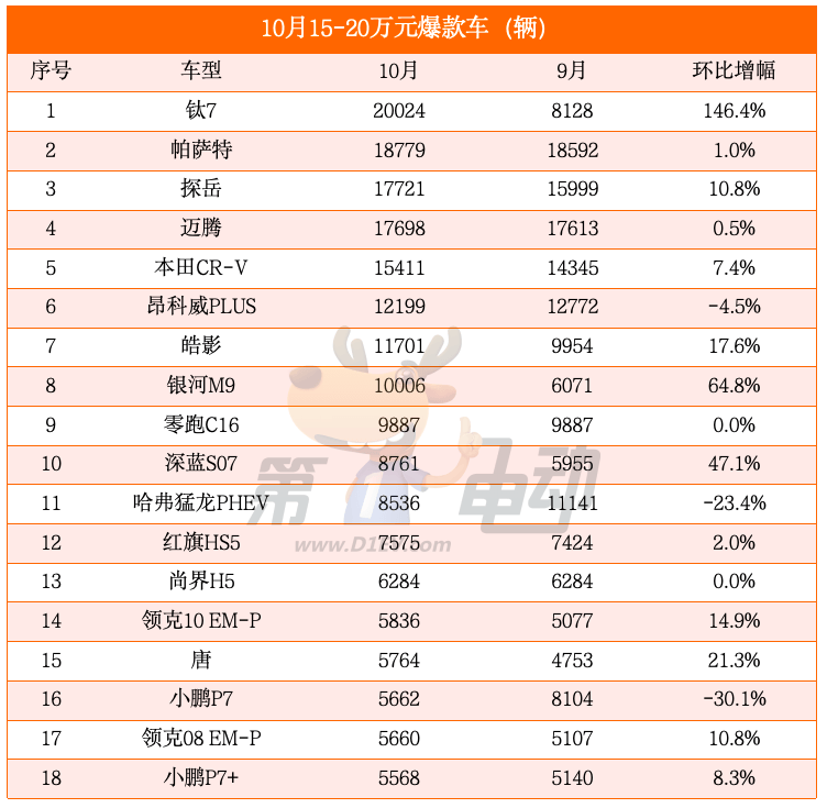 在1-10月15-20万元爆款榜基础上,10月爆款榜的18款车型迎来洗牌,钛7、银河M9、尚界H5、领克10 EM-P、领克08 EM-P和小鹏P7强势入局。