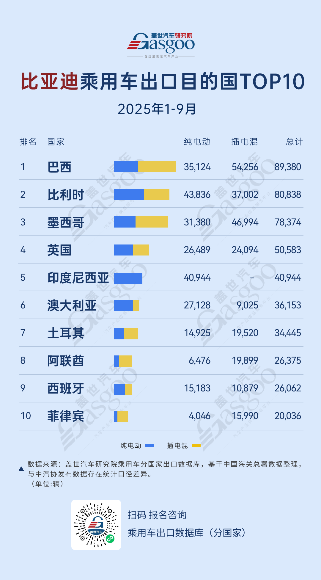 NO.1 巴西。2025年1-9月,向巴西出口纯电动乘用车35,124辆,插电混合动力乘用车54,256辆,总计89,380辆。