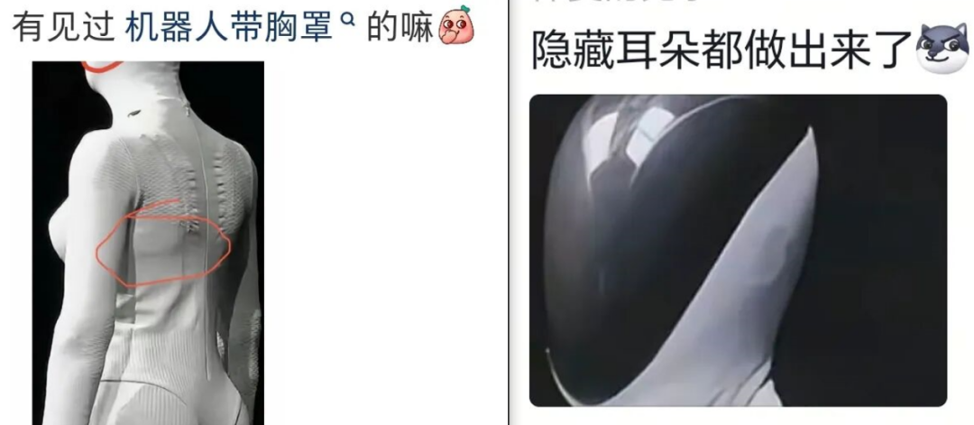 有网友分析,IRON从外观到步态都过于逼真,甚至怀疑“皮套”当中内藏真人扮演者,其证据有“隐藏耳朵”、“疑似胸罩带”、“机器人肋骨外翻”等等细节上的疑点。