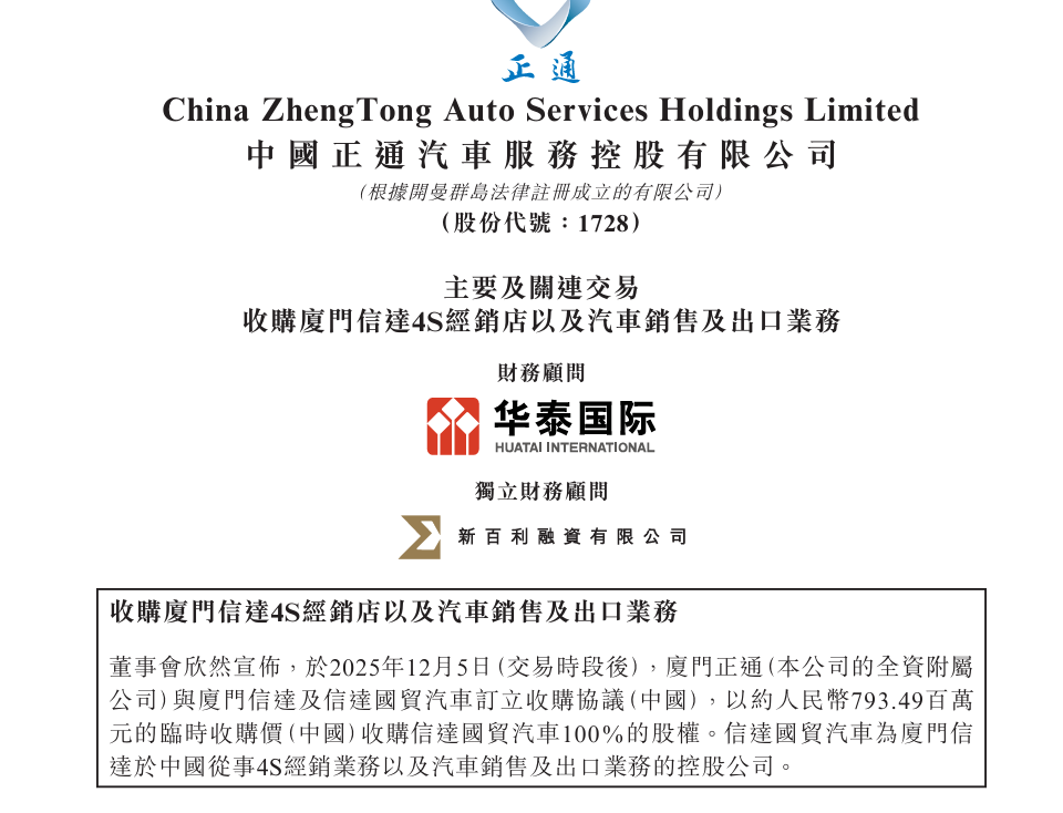 2025年12月5日,港股上市的中国正通汽车服务控股有限公司(以下简称“正通汽车”)宣布,计划以大约8.15亿元人民币的总价,收购厦门信达旗下全部汽车经销与出口业务。